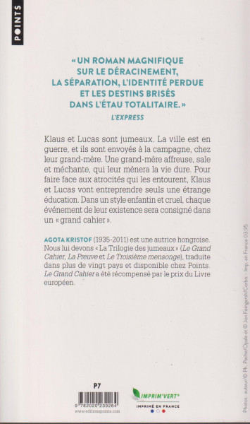 Dans un pays ravagé par la guerre, deux enfants (des jumeaux) abandonnés a eux-memes font seuls l'apprentissage de la vie, de l'écriture et de la cruauté. Premier roman d'une émigrée hongroise installée en Suisse, Le Grand Cahier est également le premier volet d'une trilogie qui comprend La Preuve et Le Troisieme Mensonge. L'ouvre d'Agota Kristof est aujourd'hui traduite dans une quinzaine de pays.