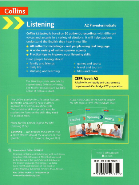 To improve your listening skills, you need to hear real conversations. That’s why Collins Listening (A2) is based entirely on 20 authentic recordings.