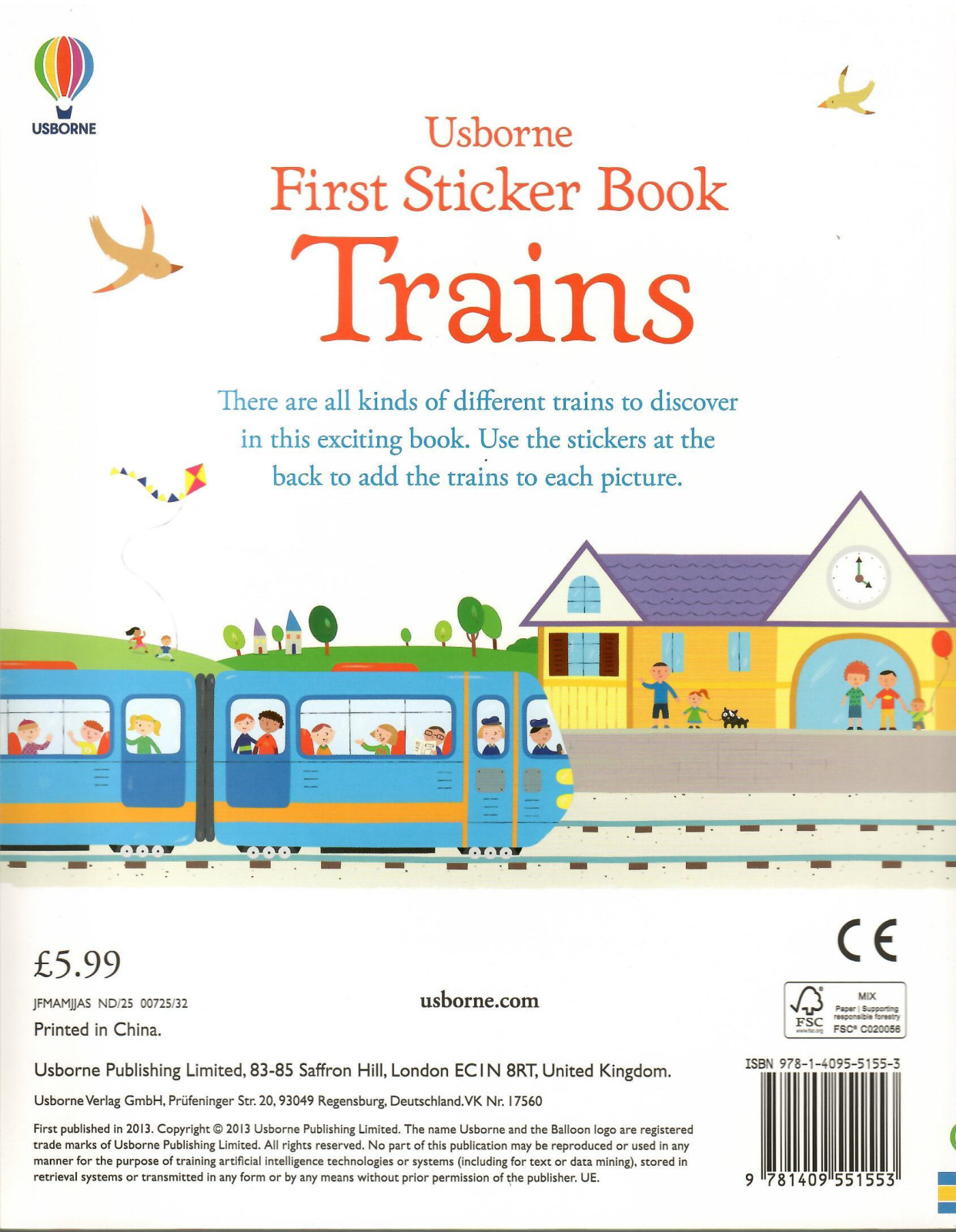 Scenes include Freight trains, Monorail, Steam train, Underground train, Busy platform and Make your own train. Over 80 stickers to add to the pages.