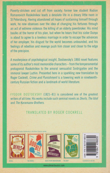 Having abandoned all hopes of sustaining himself through work, he now obsesses over the idea of changing his fortunes through an act of extreme violence: the killing of an elderly pawnbroker. His mind baulks at the horror of his plan, but when he hears that his sister Dunya is about to agree to a loveless marriage in order to escape the advances of her employer, his disgust for the world becomes unbounded, and his feelings of rebellion and revenge push him closer and closer to the edge of the precipice.