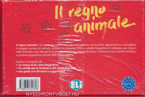 Gli animali presentati appartengono a diverse categorie: domestici, della savana, della fattoria, del bosco, del polo, della montagna, del mare, della giungla e hanno diverse caratteristiche: con due zampe, con quattro zampe, con le pinne, con le ali, con le orecchie, con le corna, con la coda, con gli zoccoli, con la pelliccia, con le piume, o anche carnivori, erbivori, invertebrati, mammiferi… Il gioco si puo utilizzare anche come tombola.Obiettivi linguistici Il gioco, attraverso una serie di situazioni stimolanti e divertenti, amplia il bagaglio lessicale, facilita l’apprendimento di nuovi vocaboli e rinforza l’uso corretto delle strutture linguistiche: “Dove vivono? Cosa mangiano?”.Contenuto Il gioco e composto da un mazzo di 66 cartefotografiche e 36 cartelle con le liste degli animali e sul retro le schede per il gioco della tombola.