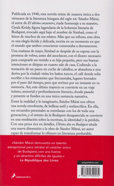 Publicada en 1940, esta novela reúne de manera única a dos virtuosos de la literatura húngara del siglo XX: Sándor Márai, el autor de El último encuentro, rinde homenaje a su maestro, Gyula Krúdy, personaje legendario de la bohemia literaria de Budapesty autor de una serie de novelas con Simbad como protagonista.Una manana de mayo, Simbad se despide de su esposa con la promesa de volver, antes de que anochezca, con el dinero necesario para comprarle un vestido a su pequena hija. Cediendo a la tentación de un paseo en carruaje, se entrega a un apacible paseo por la capital a través de sus lugares favoritos: el bano turco, el café en el que escribió o sus restaurantes preferidos. Entre realidad y ficción, Sándor Márai nos ofrece una historia donde sus propios recuerdos de antes de la guerra se mezclan con la imaginación de Gyula Krúdy, uno de los más grandes escritores húngaros.