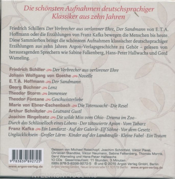 Diese Sammlerbox bringt die schönsten Aufnahmen klassischer deutschsprachiger Erzählungen aus zehn Jahren Argon-Verlagsgeschichte zu Gehör – gelesen von herausragenden Sprechern wie u.a. Sabine Falkenberg, Hans-Peter Hallwachs und Gerd Wameling.
