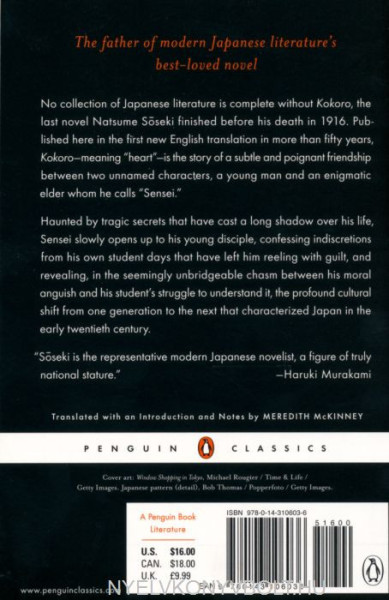 Kokoro, meaning 'heart', is a tantalising novel about the friendship between a young man and an enigmatic elder whom he calls Sensei.