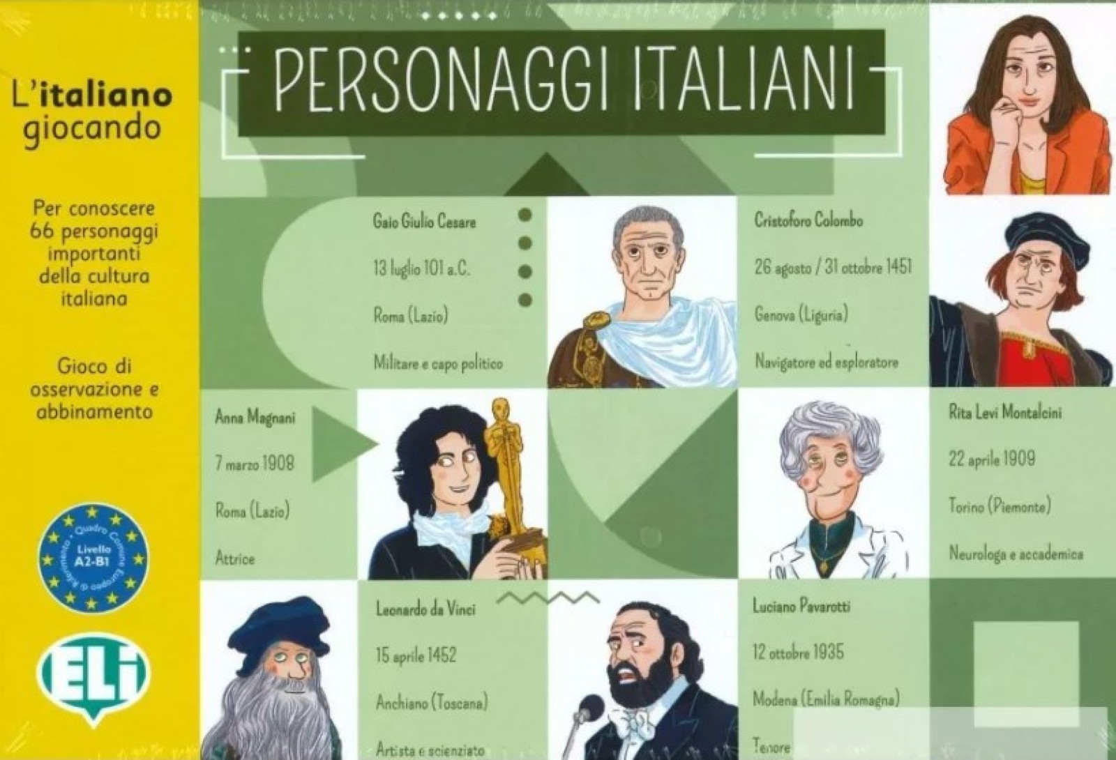 Az olasz nyelvű országok személyiségeit bemutató kártyajáték az olasz nyelvű kultúra és országismeret népszerű személyiségeinek portré-kártyáit tartalmazza, amelyeket a megfelelő profilokhoz kell társítani.A nyelvtanulók a játék segítségével szórakoztató és igényes módon, olasz nyelvi kifejezőeszközök segítségével gyakorolhatják, hogyan kell egy személyt leírni vagy akár csak felismerni.A játék 66 db portrét ábrázoló képkártyát és 66 profilkártyát tartalmaz, amelyen fontos információk találhatóak az adott személyiséghez.