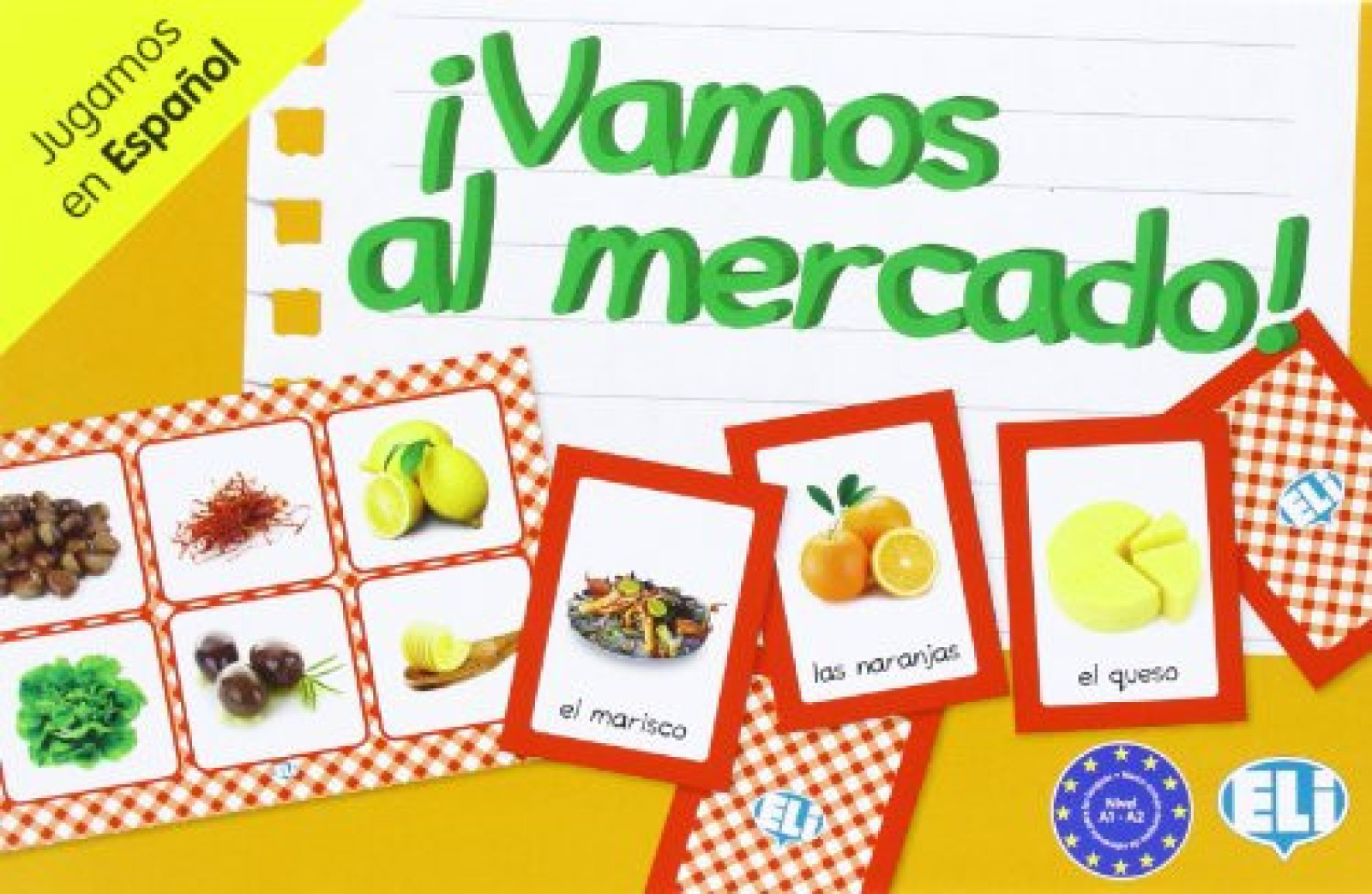 Además, ayuda a ampliar el conocimiento de vocabulario del estudiante, presentando alimentos y bebidas en un ambiente estimulante y entretenido como es el mundo de las compras. El juego se compone de: una baraja de 66 cartas fotográficas, 36 listas de la compra, que por detrás son tarletas para el juego de la Tómbola, un manual de instrucciones. El manual contiene las instrucciones del juego, sugerencias para más actividades, preguntas sobre gastronomia, recetas típicas y una lista de refranes y expresiones relacionadas con los alimentos.