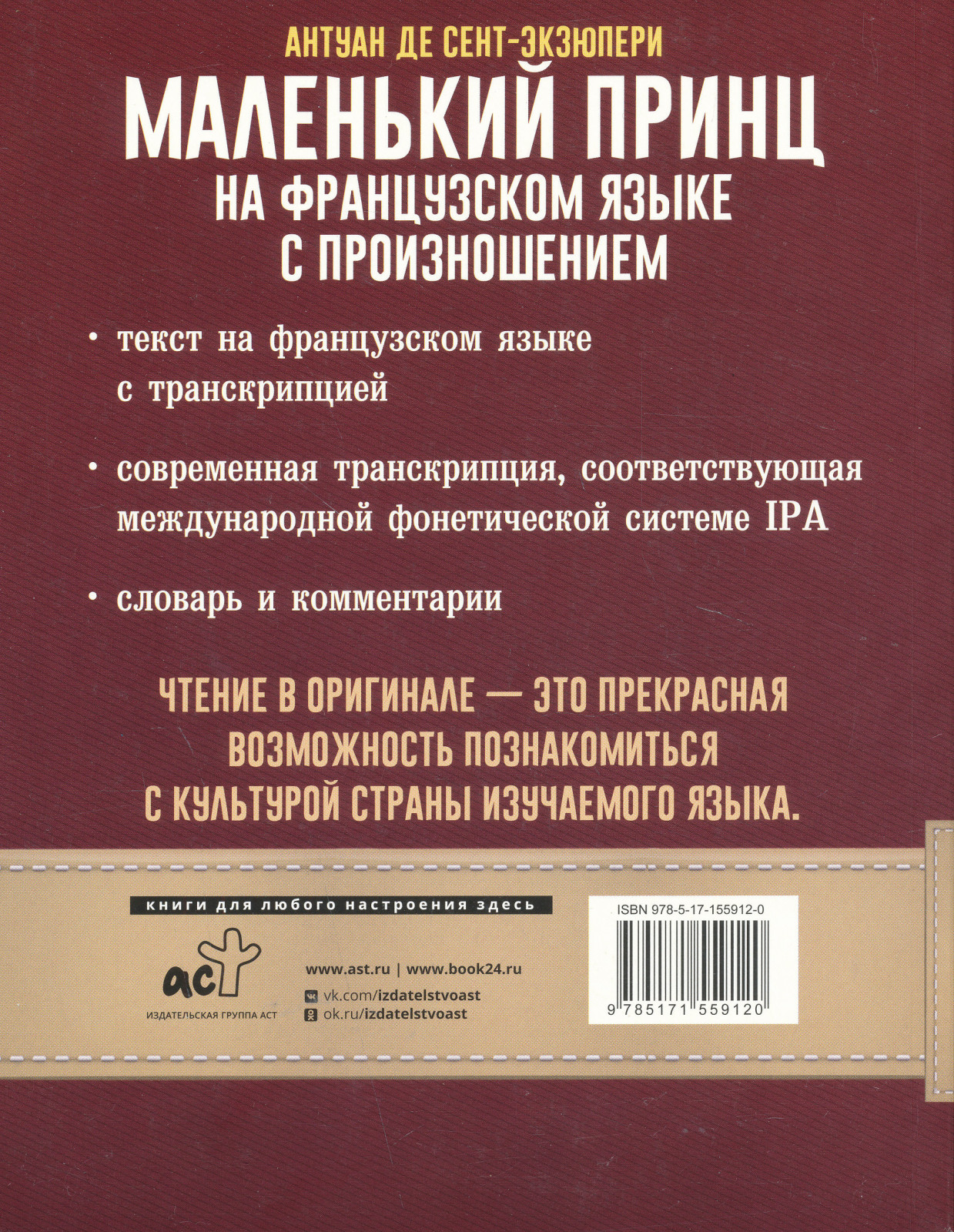 Na protjazhenii vsej knigi avtor napominaet, kak vazhno "sokhranit v sebe rebenka" i, vzrosleja, ne zabyvat o svoikh mechtakh i talantakh. Esli vy tolko nachinaete uchit frantsuzskij jazyk, objazatelno prochtite eto prekrasnoe proizvedenie na jazyke originala. Tekst podgotovlen dlja nachalnogo urovnja vladenija frantsuzskim jazykom. Pod kazhdym slovom dobavlena transkriptsija, sootvetstvujuschaja mezhdunarodnoj foneticheskoj sisteme IPA. V kontse knigi raspolozhen nebolshoj frantsuzsko-russkij slovar. Zamechatelnye illjustratsii pozvoljat polnotsenno pogruzitsja v volshebnuju atmosferu etoj knigi. Izdanie prednaznacheno dlja vsekh, kto izuchaet frantsuzskij jazyk i stremitsja dostich uspekhov. Chtenie v originale - eto prekrasnaja vozmozhnost poznakomitsja s kulturoj strany izuchaemogo jazyka.