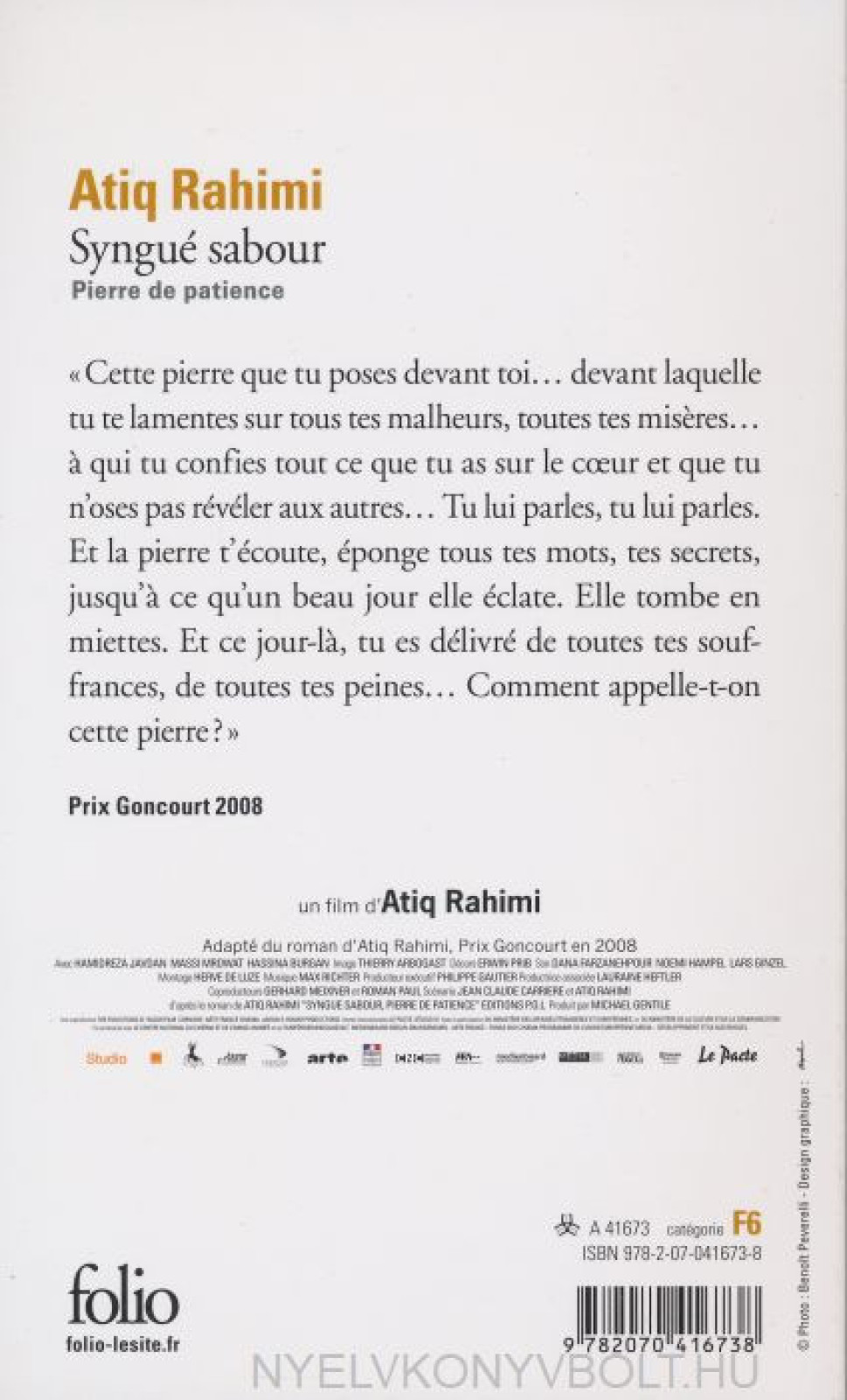 Pierre de patience. Dans la mythologie perse, il s'agit d'une pierre magique que l'on pose devant soi pour déverser sur elle ses malheurs, ses souffrances, ses douleurs, ses miseres...