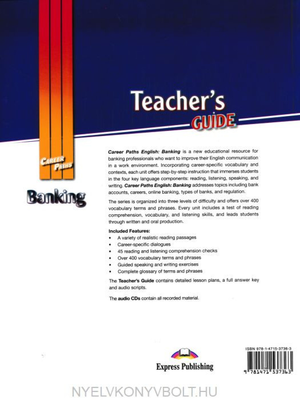 Incorporating career specific vocabulary and contexts, each unit offers step-by-step instruction that immerses students in the four key language components: reading, listening, speaking and writing. Career Paths: Banking addresses topics including classroom supplies, assessments, stories and reading, lesson plan formats and classroom management.The series is organized into three levels of difficulty and offers a minimum of 400 vocabulary terms and phrases. Every unit includes a test of reading comprehension, vocabulary and listening skills and leads students through written and oral production.