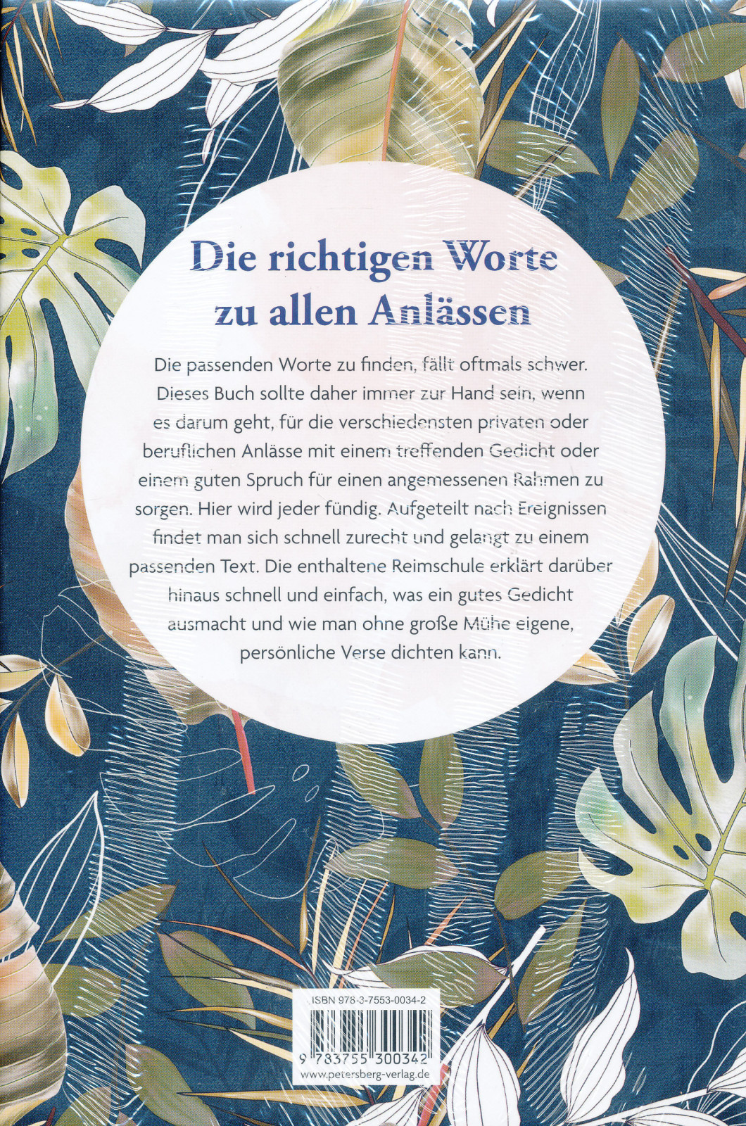 Dieses Buch sollte daher immer zur Hand sein, wenn es darum geht, für die verschiedensten privaten oder beruflichen Anlässe mit einem treffenden Gedicht oder einem guten Spruch für einen angemessenen Rahmen zu sorgen. Aufgeteilt nach Ereignissen findet man sich schnell zurecht und gelangt zu einem passenden Text. Die enthaltene Reimschule erklärt darüber hinaus schnell und einfach, was ein gutes Gedicht ausmacht und wie man ohne große Mühe eigene, persönliche Verse dichten kann. In dieser hochwertige Ausgabe mit Hardcover-Einband, Schutzumschlag und Lesebändchen wird jeder fündig!