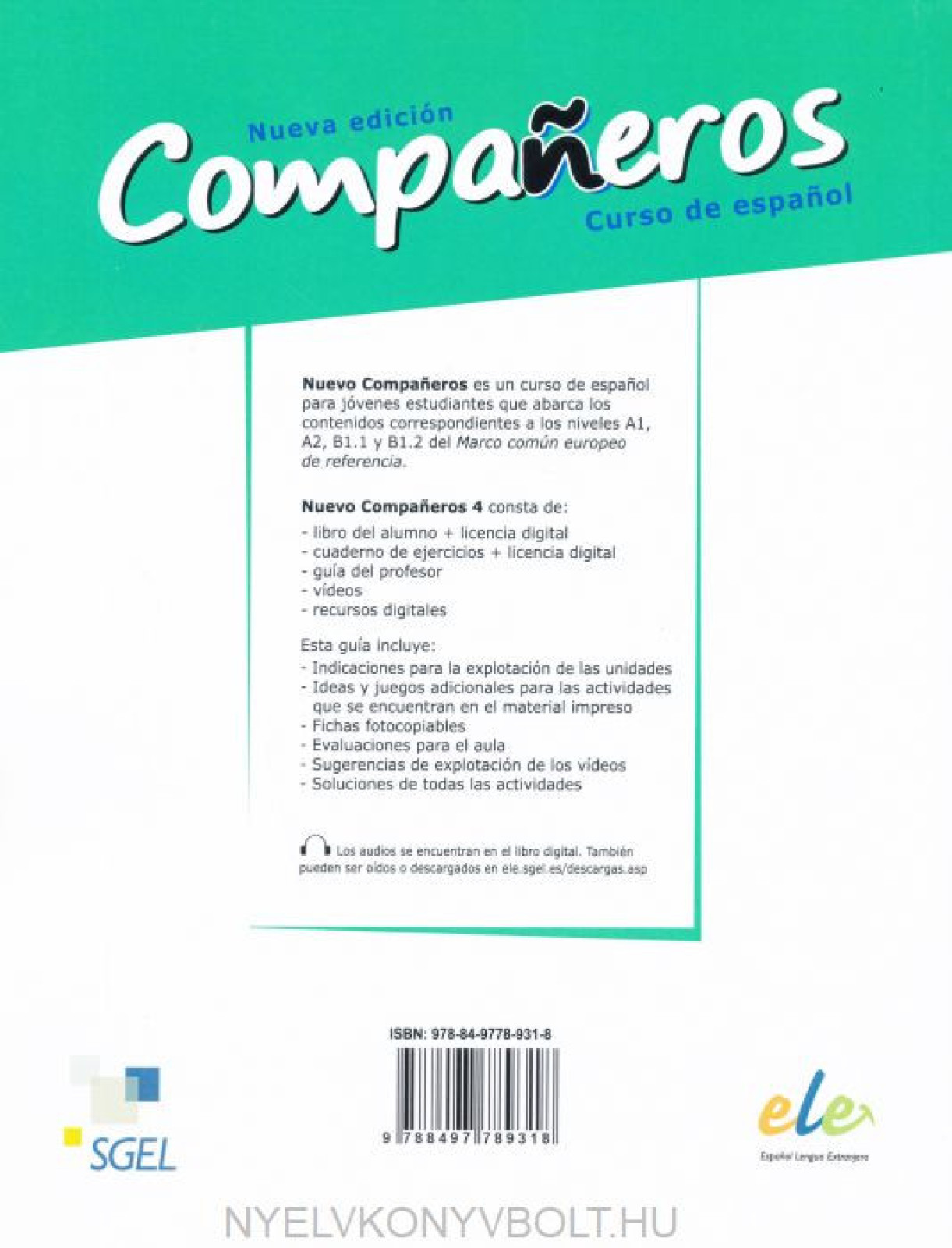 Ofrece explicaciones metodologicas que incluyen notas sobre gramatica, funciones comunicativas e informacion cultural.Companeros 4 Nueva edicion guia didactica incluye:- Sugerencias metodologicas para el profesor que se presentan unidad por unidad(con las soluciones de las actividades que hay en el libro del alumno y en el cuaderno de ejercicios)- Material complementario, fotocopiable, para trabajar dentro y fuera del aula.- Al final de la guia se ofrece una guia de lectura de El chocolate, de la coleccion Saber.es, lectura graduada de nivel B1.2.- Evaluaciones unidad por unidad, para conocer el progreso del alumno, con las soluciones.- Sugerencias de explotacion didactica de los videos para el profesor (disponibles en el canal de Youtube "SGEL ELE Espanol para extranjeros"), con las transcripciones y fichas de trabajo, fotocopiables, para los alumnos.