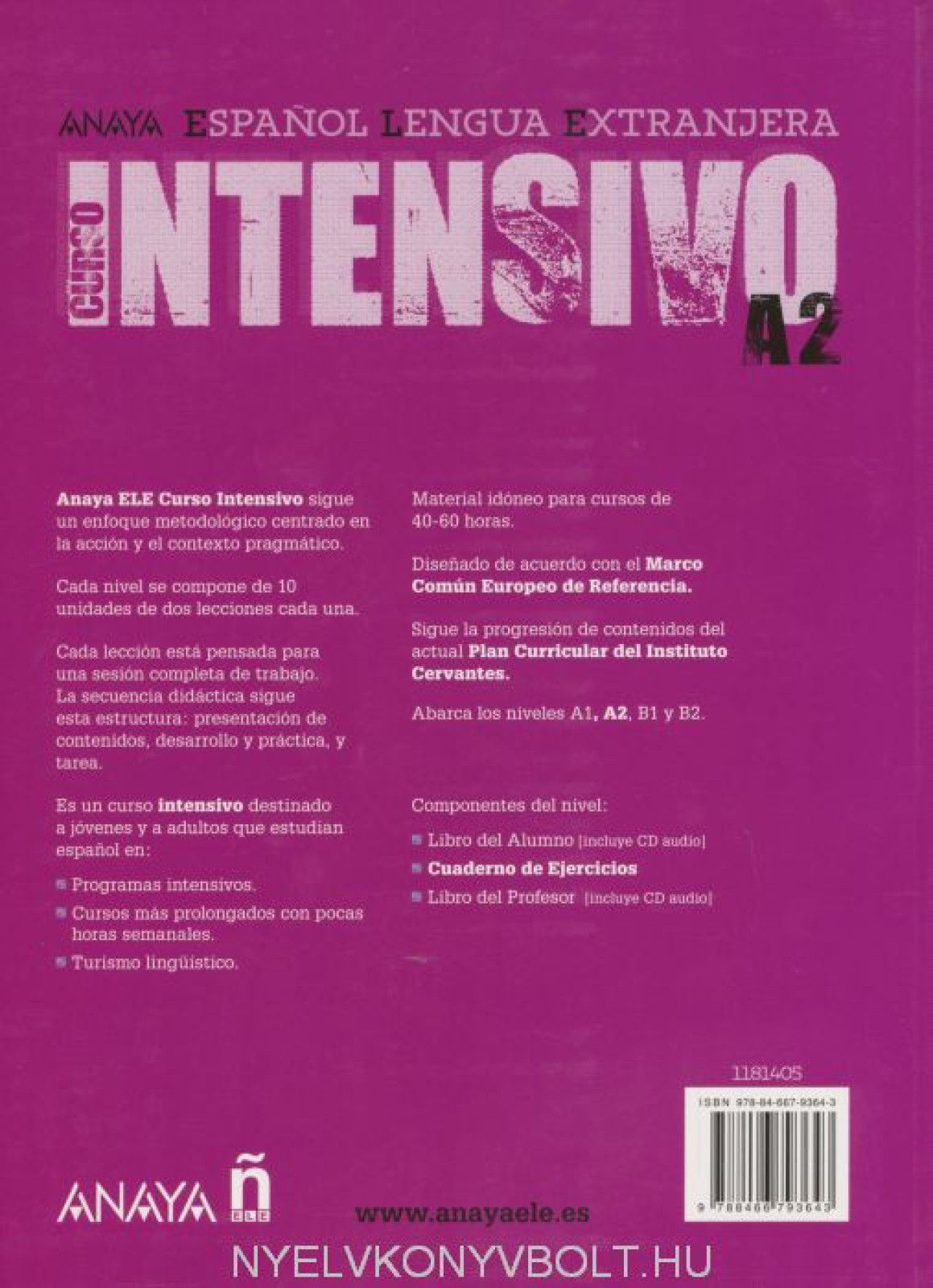 Anaya ELE Curso Intensivo sigue un enfoque metoddológico centrado en la acción y el contexto pragmatico. Cada nivel se compone de 10 unidades de dos lecciones cada una. Cada lección está pensada para una sesión completa de trabajo. La secuencia didáctica sigue esta estructura: presentación de contenidos, desarrollo y práctica, y tarea. Es un curso intensivo destinado a jóvenes y a adultos que estudian espanol en: Programas intensivos, Cursos más prolongados con pocas hores semanales, Turismo lingüístico.