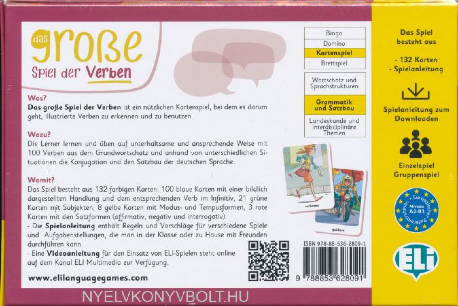 - 100 illustrated cards with the infinitive verb written below the picture- 21 green cards indicating the subject of the sentence- 8 yellow cards indicating the mood and tense- 3 red cards with the affirmative, negative and interrogative formA teacher's booklet, which gives suggestions of different games, is included with the set. (CEFR A2-B1)