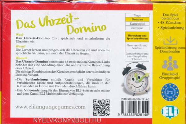 The box contains 48 cards. Each card has a clock face on the left and a written time on the right. By correctly matching the cards, you can complete the game dominoes.The instruction booklet provides suggestions for a wide range of games and activities to do in class or at home with friends. (CEFR A1-A2)