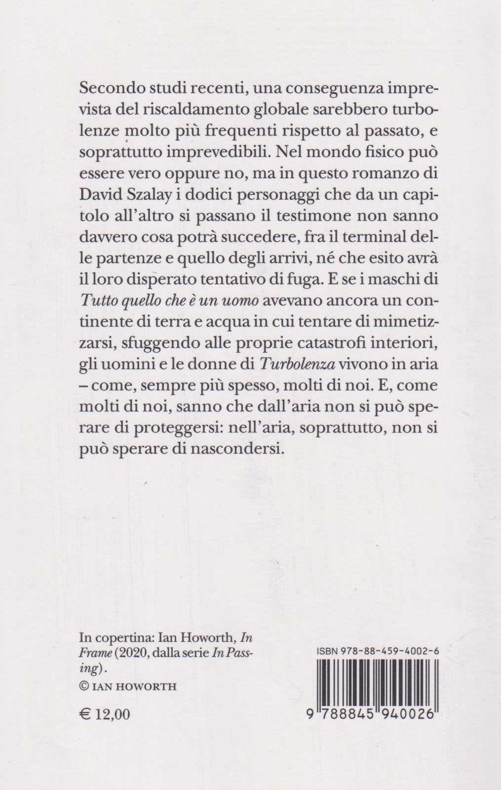 Secondo studi recenti, una conseguenza imprevista del riscaldamento globale sarebbero turbolenze molto piu frequenti rispetto al passato, e soprattutto imprevedibili. Nel mondo fisico puo essere vero oppure no, ma in questo romanzo di David Szalay i dodici personaggi che da un capitolo all’altro si passano il testimone non sanno davvero cosa potra succedere, fra il terminal delle partenze e quello degli arrivi, né che esito avra il loro disperato tentativo di fuga. E se i maschi di Tutto quello che e un uomo avevano ancora un continente di terra e acqua in cui tentare di mimetizzarsi, sfuggendo alle proprie catastrofi interiori, gli uomini e le donne di "Turbolenza" vivono in aria – come, sempre piu spesso, molti di noi. E, come molti di noi, sanno che dall’aria non si puo sperare di proteggersi: nell’aria, soprattutto, non si puo sperare di nascondersi.