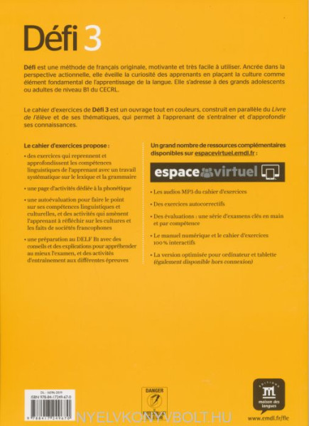 A Défi 3 egy színes munkafüzet, amelyet párhuzamosan készítettek el a tankönyvvel. Olyan témákat dolgoz fel, amelyek segítségével a tanuló elmélyíti és a gyakorlatban is használni tudja a megszerzett tudását.