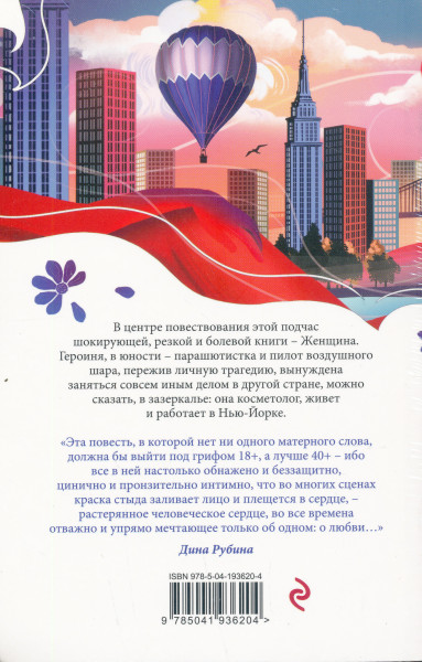 Geroinja, v junosti - parashjutistka i pilot vozdushnogo shara, perezhiv lichnuju tragediju, vynuzhdena zanjatsja sovsem inym delom v drugoj strane, mozhno skazat, v zazerkale: ona kosmetolog, zhivet i rabotaet v Nju-Jorke. Tselaja verenitsa strannykh personazhej prokhodit pered ee glazami, ibo, po rodu svoej nyneshnej professii, geroinja stalkivaetsja s fantasticheskimi, na segodnjashnij den pochti obydennymi "gendernymi perevertyshami", s obeskurazhivajuschimi, a to i ottalkivajuschimi kartinkami zhizni obschestva. I, kak ni stranno, iz etoj girljandy, po vyrazheniju geroini, "kalek" vyrastaet groteskovyj, tragicheskij, nichtozhnyj i vysokij obraz sovremennoj ljubvi.
