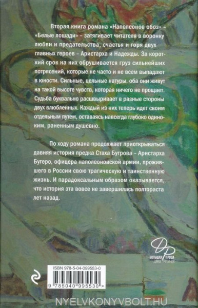 Vtoraja kniga romana «Napoleonov oboz» – «Belye loshadi» – zatjagivaet chitatelja v voronku ljubvi i predatelstva, schastja i gorja dvukh glavnykh geroev – Aristarkha i Nadezhdy.