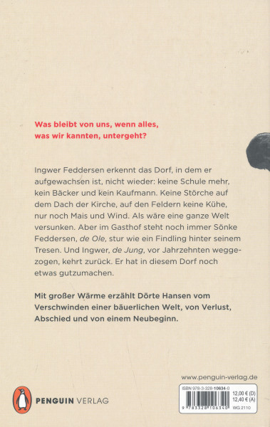 Die Wolken hängen schwer über der Geest, als Ingwer Feddersen, 47, in sein Heimatdorf zurückkehrt. Er hat hier noch etwas gutzumachen. Großmutter Ella ist dabei, ihren Verstand zu verlieren, Großvater Sönke hält in seinem alten Dorfkrug stur die Stellung. Er hat die besten Zeiten hinter sich, genau wie das ganze Dorf. Wann hat dieser Niedergang begonnen? In den 1970ern, als nach der Flurbereinigung erst die Hecken und dann die Vögel verschwanden? Als die großen Höfe wuchsen und die kleinen starben? AlsIngwer zum Studium nach Kiel ging und den Alten mit dem Gasthof sitzen ließ? Mit großer Wärme erzählt Dörte Hansen vom Verschwinden einer bäuerlichen Welt, von Verlust, Abschied und von einem Neubeginn.