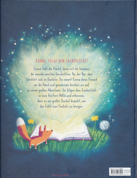 Emma liebt ihre Gute-Nacht-Geschichten, besonders die über Bo, den Bären, der Angst vor der Dunkelheit hat. Als Bo plötzlich zum Leben erwacht, will Emma ihm helfen, seine Angst zu überwinden und ihm die Schönheit der Nacht zeigen. Mit einer Laterne in der einen Hand und Bos Pfote in der anderen betritt Emma eine finstere Höhle und plötzlich leuchtet über ihnen ein magisch funkelnder Sternenhimmel auf. Hier, wo Licht und Finsternis aufeinandertreffen, fühlen sich Emma Bo sicher und geborgen, und Bo erkennt, dass das Dunkel gar nicht so gefährlich ist, sondern wunderschön sein kann.