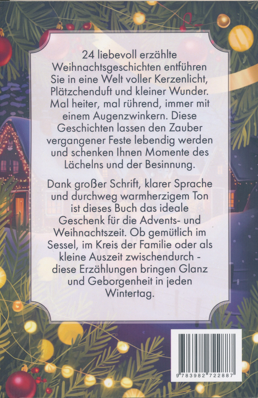Ein Buch voller Wärme, Erinnerungen und kleiner Wunder. 24 weihnachtliche Kurzgeschichten, die Senioren verzaubern und Herz und Seele berühren. Jede Geschichte dauert nur etwa fünf Minuten und ist damit perfekt für kleine Pausen, gemütliche Abende oder zum Vorlesen in der Familie. Mal heiter, mal besinnlich, mal nostalgisch oder mit einem Augenzwinkern - dieses Buch fängt die schönsten Facetten der Weihnachtszeit ein. Ob Kindheitserinnerungen, kleine Missgeschicke oder rührende Begegnungen, jede Erzählung ist einzigartig und schenkt einen Moment voller Freude. Dank großer Schrift, klarer Sprache und kurzen Sätzen ist das Lesen entspannt und mühelos....