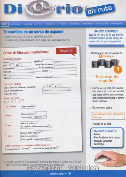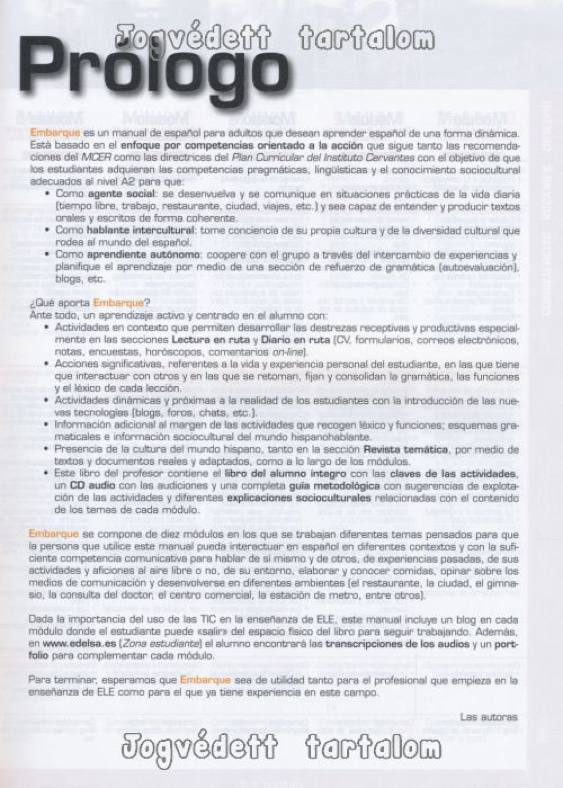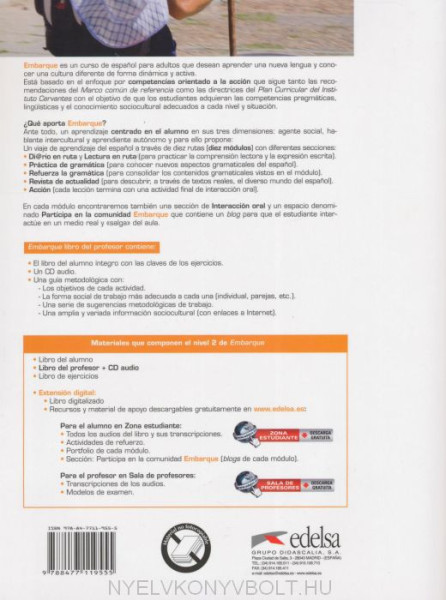 Embarque es un curso de espanol para adultos que desean aprender una nueva lengua y conocer una cultura diferente de forma dinámica y activa. Está basado en el enfoque por competencias orientado a la acción que sigue tanto las recomendaciones del Marco común de referencia como las directrices del Plan Curricular del Instituto Cervantes con el objetivo de que los estudiantes adquieran las competencias pragmáticas, lingüísticas y el conocimiento socicultural adecuados a cada nivel y situación.