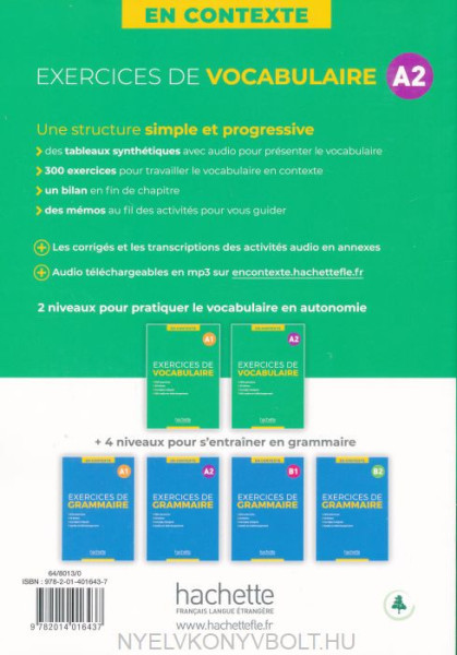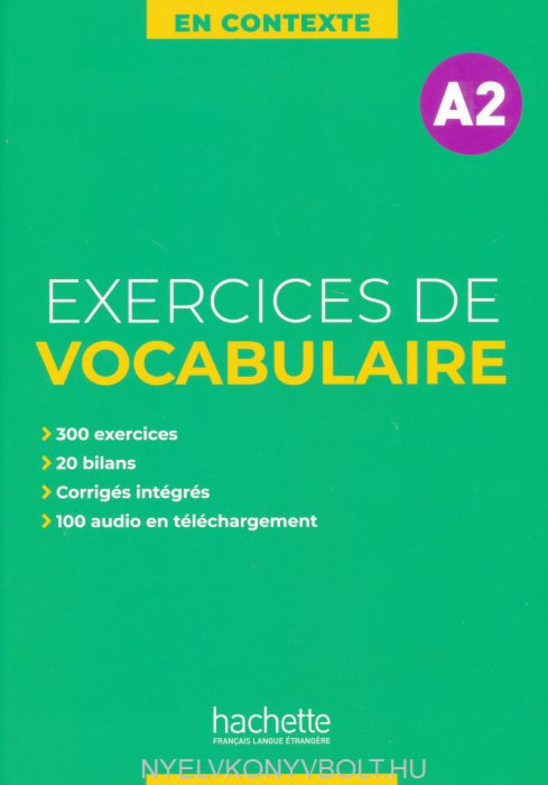 › Une structure simple et progressive pour s'entraîner en vocabulairedu niveau A2 en autonomie avec :300 exercices pour s’entraîner20 bilans pour faire le pointles corrigés et transcriptions en annexes100 audios MP3 a télécharger sur encontexte.hachettefle.fr