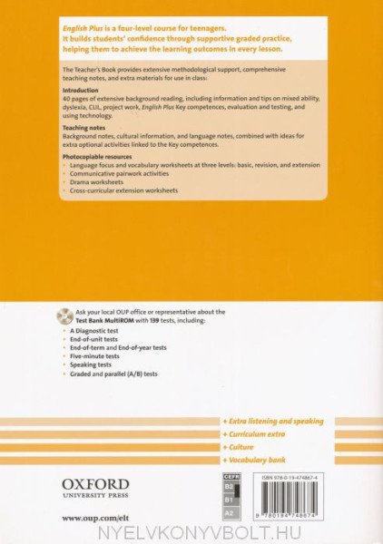 English Plus develops students' communication skills through a structured and methodical approach, helping students to achieve their individual learning outcomes in every lesson.• One lesson-per-page structure means teachers can pick up and teach the course• 'I can' statements, learning objectives, and presentation-practice-production methodology ensures all students achieve a productive outcome, regardless of their ability• Step-by-step writing lessons and step-by-step speaking practice to buildstudents' confidence• Options provides four optional extra lessons of CLIL, Culture, Vocabulary, or Listening and Speaking practice for each unit, linked to topics and language in the main units• Graded grammar and vocabulary photocopiables in the Teacher's Book offer the opportunity to supplement or extend lessons• Finished? activities ensure fast finishers are kept busy throughout the lesson