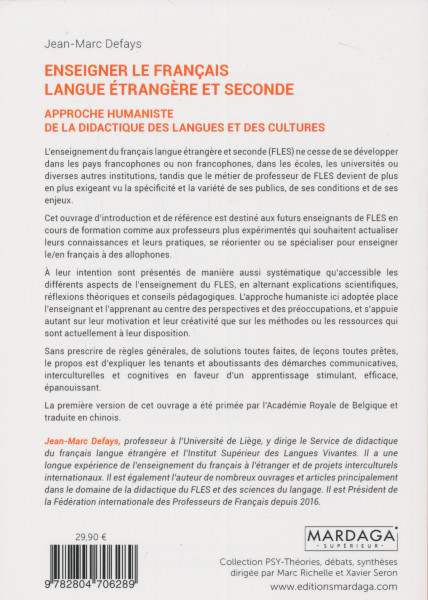 ...enseigner le/en français a des allophones. A leur intention sont présentés de maniere aussi systématique qu’accessible les différents aspects de l’enseignement du FLES, en alternant explications scientifiques, réflexions théoriques et conseils pédagogiques. L’approche humaniste ici adoptée place l’enseignant et l’apprenant au centre des perspectives et des préoccupations, et s’appuie autant sur leur motivation et leur créativité que sur les méthodes ou les ressources qui sont actuellement a leur disposition.