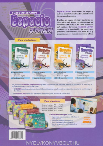 Este curso está dirigido a estudiantes jóvenes/adolescentes y conduce a la adquisición de una competencia comunicativa del nivel B1.1. Material de nueva generación: plataforma educativa, actividades multimedia, vídeos, componentes para PDI. La presentación y secuenciación de los contenidos, las dinámicas de clase y la guía didáctica del profesor hacen de Espacio Joven un material idóneo para la Ensenanza reglada. Cada unidad incluye un vídeo de una situación cercana al estudiante y actividades interactivas para practicar los contenidos aprendidos en casa o en clase. Cada nivel incluye unidades de repaso, un apéndice gramatical, una tabla de verbos y un glosario en diferentes idiomas. Incluye actividades para trabajar las distintas pruebas del examen DELE. El Libro del alumno incluye un CD-ROM del alumno que permite al estudiante trabajar rápida y cómodamente desde su ordenador, accediendo a un solo clic a audiciones, vídeos, actividades interactivas y test de evaluación.