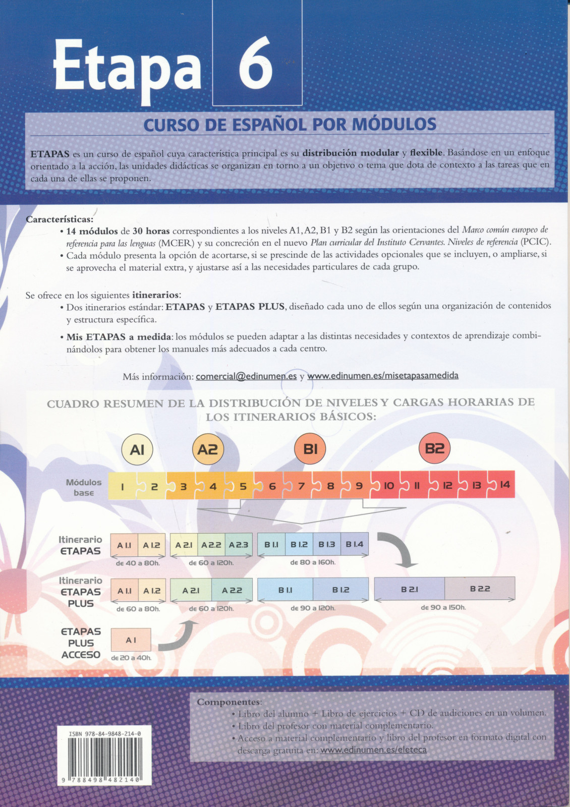 20 horas de actividades y materiales extra que permiten al profesor adaptar Etapas a las horas y necesidades de su clase.El Libro del profesor es una completa guía que incluye:Sugerencias de explotación y claves del Libro del alumno.Claves delLibro de ejercicios.Transcripciones del Libro del alumno.Transcripciones del Libro de ejercicios.Fichas y transparencias.