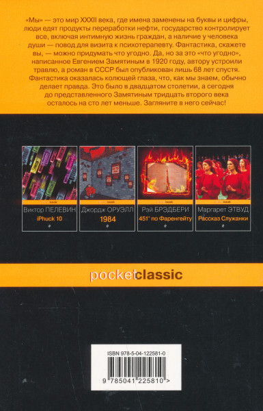 My - eto mir XXXII veka, gde imena zameneny na bukvy i tsifry, ljudi edjat produkty pererabotki nefti, gosudarstvo kontroliruet vsjo, vkljuchaja intimnuju zhizn grazhdan, a nalichie u cheloveka dushi - povod dlja vizita k psikhoterapevtu. Fantastika, skazhete vy, - mozhno pridumat vse chto ugodno. Da, no za eto "chto ugodno", napisannoe Evgeniem Zamjatinym v 1920 godu, avtoru ustroili travlju, a roman v SSSR byl opublikovan lish 68 let spustja. Fantastika okazalas koljuschej glaza, chto, kak my znaem, obychno delaet pravda. Eto bylo v dvadtsatom stoletii, a segodnja do predstavlennogo Zamjatinym tridtsat vtorogo veka ostalos na sto let menshe. Zagljanite v nego sejchas!
