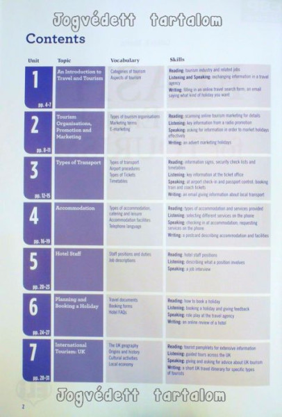 Topics covered:. Tourism organisations, promotion andmarketing. Types of transport. Accommodation. Hotel staff. Planning and booking a holiday. Tourism in the UK. Tourism in Europe`p>. Tourism in the USA. Ecotourism. New tourist destinations