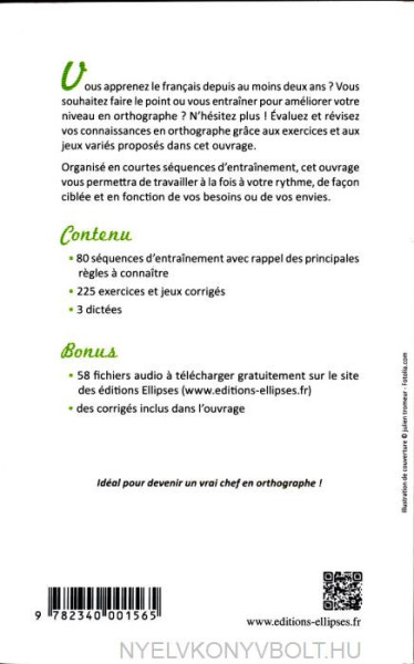 Évaluez et révisez vos connaissances en orthographe grâce aux exercices et aux jeux variés proposés dans cet ouvrage. Organisé en courtes séquences d'entraînement, cet ouvrage vous permett ra de travailler a la fois a votre rythme, de façon ciblée et enfonction de vos besoins ou de vos envies. Contenu - 80 séquences d'entraînement avec rappel des principales regles a connaître - 225 exercices et jeux corrigés - 3 dictées Bonus - 58 fichiers audio a télécharger gratuitement sur le site des éditions Ellipses (www.editions-ellipses.fr).