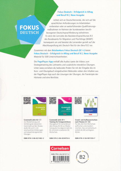 Das Lehrwerk Fokus Deutsch B2 setzt die Lernziele des Berufssprachkurses B2 des Bundesamts für Migration und Flüchtlinge (BAMF) konsequent um und bereitet die Lernenden gezielt auf die Abschlussprüfung Deutsch-Test für den Beruf B2 vor.