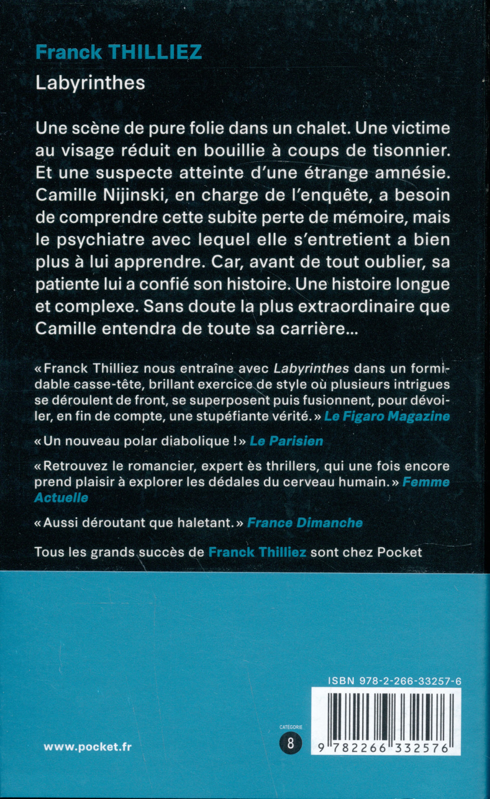 Une scene de pure folie dans un chalet. Une victime au visage réduit en bouillie a coups de tisonnier. Et une suspecte atteinte d'une étrange amnésie.Camille Nijinski, en charge de l'enquete, a besoin de comprendre cette subite perte de mémoire, mais le psychiatre avec lequel elle s'entretient a bien plus a lui apprendre. Car, avant de tout oublier, sa patiente lui a confié son histoire. Une histoire longue et complexe. Sans doute la plus extraordinaire que Camille entendra de toute sa carriere...