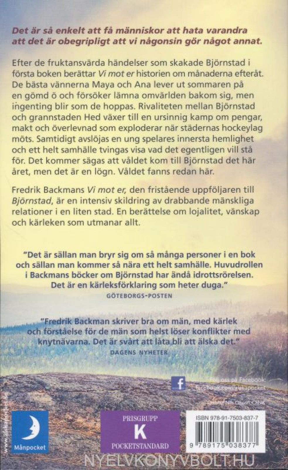 Efter de fruktansvärda händelser som skakade Björnstad i första boken berättar Vi mot er historien om manaderna efterat. De bästa vännerna Maya och Ana lever ut sommaren pa en gömd ö och försöker lämna omvärlden bakom sig, men ingenting blir som de hoppas. Rivaliteten mellan Björnstad och grannstaden Hed växer till en ursinnig kamp om pengar, makt och överlevnad som exploderar när städernas hockeylag möts. Samtidigt avslöjas en ung spelares innersta hemlighet och ett helt samhälle tvingas visa vad det egentligen vill sta för. Det kommer sägas att valdet kom till Björnstad det här aret, men det är en lögn. Valdet fanns redan här. Fredrik Backmans Vi mot er, den fristaende uppföljaren till Björnstad, är en intensiv skildring av drabbande mänskliga relationer i en liten stad. En berättelse om lojalitet, vänskap och kärleken som utmanar allt. Det är sällan man bryr sig om sa manga personer i en bok och sällan man kommer sa nära ett helt samhälle.