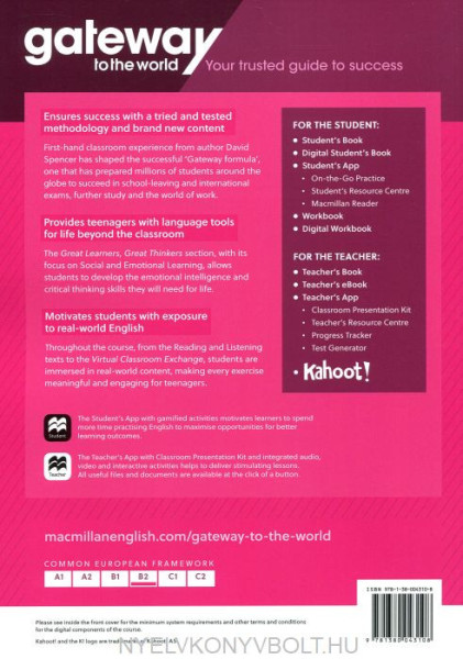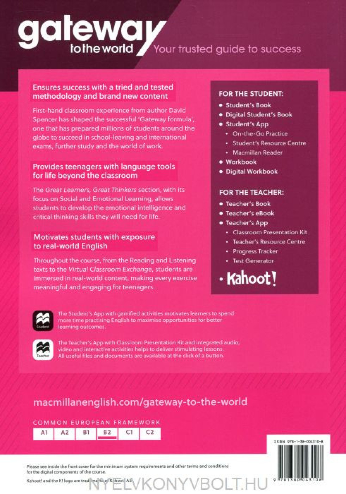 The successful ‘Gateway formula’ has prepared millions of students around the globe to succeed in the school-leaving and international exams, further study and the world of work. Thoroughly tested and perfected as a result of extensive research, Gateway to the World is full of fresh and relevant material for great lessons that will excite and motivate teenage learners and enable them to achieve their goals at school and in life.