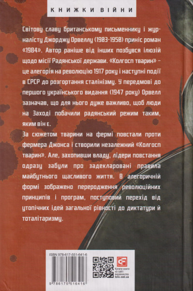 Tvarini na fermi povstali proti fermera Dzhonsa i stvorili nezalezhnij "Kolgosp tvarin". Ale, zakhopivshi vladu, lideri povstannja odrazu zabuli pro zadeklarovani pravila majbutnogo schaslivogo zhittja. V alegorichnij formi zobrazheno pererodzhennja revoljutsijnikh printsipiv i program, postupovij perekhid vid utopichnikh idej zagalnoji rivnosti do diktaturi i totalitarizmu. Najvidomisha tsitata "Usi tvarini rivni, ale dejaki tvarini rivnishi za inshikh", jak i sam tvir, ne vtratili aktualnosti.