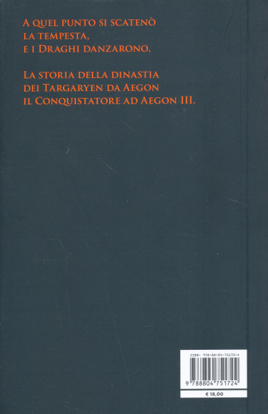 La loro storia ha inizio sotto il leggendario Aegon il Conquistatore, creatore del Trono di Spade, per proseguire con le generazioni di Targaryen che combatterono per difendere quell'iconico scranno, fino alla guerra civile che quasi ne dilanio per sempre la dinastia. In questo avvincente resoconto della loro storia, narrata dalla penna di un antico maestro della Cittadella, finalmente i frammenti e gli accenni che riecheggiavano nel ciclo epico Il Trono di Spade sono svelati in tutta l'ampiezza di un portentoso affresco. Com'e stato forgiato il Trono di Spade? Perché era cosi micidiale visitare Valyria dopo il Disastro? Quali sono stati i peggiori crimini di Maegor il Crudele? Cosa scopri Alysanne la Buona recandosi alla Barriera? Cos'e veramente successo durante la Danza dei Draghi? Sono solo alcune delle domande cui viene data risposta in questa cronaca fondamentale di Westeros.