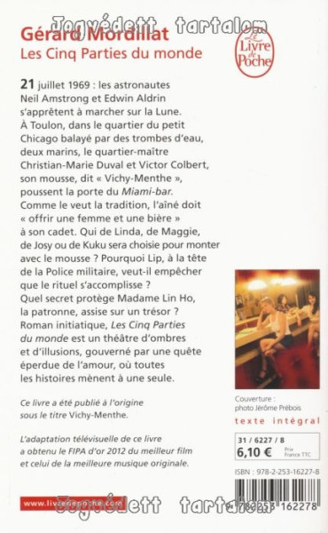 21 juillet 1969 : les astronautes Neil Amstrong et Edwin Aldrin s’appretent a marcher sur la Lune. a Toulon, dans le quartier du petit Chicago balayé par des trombes d’eau, deux marins, le quartier-maître Christian-Marie Duval et Victor Colbert, son mousse, dit « Vichy-Menthe », poussent la porte du Miami-bar. Comme le veut la tradition, l’aîné doit « offrir une femme et une biere » a son cadet. Qui de Linda, de Maggie, de Josy ou de Kuku sera choisie pour monter avec le mousse ? Pourquoi Lip, a la tete de la Police militaire, veut-il empecher que le rituel s’accomplisse ? Quel secret protege Madame Lin Ho, la patronne, assise sur un trésor ? Roman initiatique, Les Cinq Parties du monde est un théâtre d’ombres et d’illusions, gouverné par une quete éperdue de l’amour, ou toutes les histoires menent a une seule.