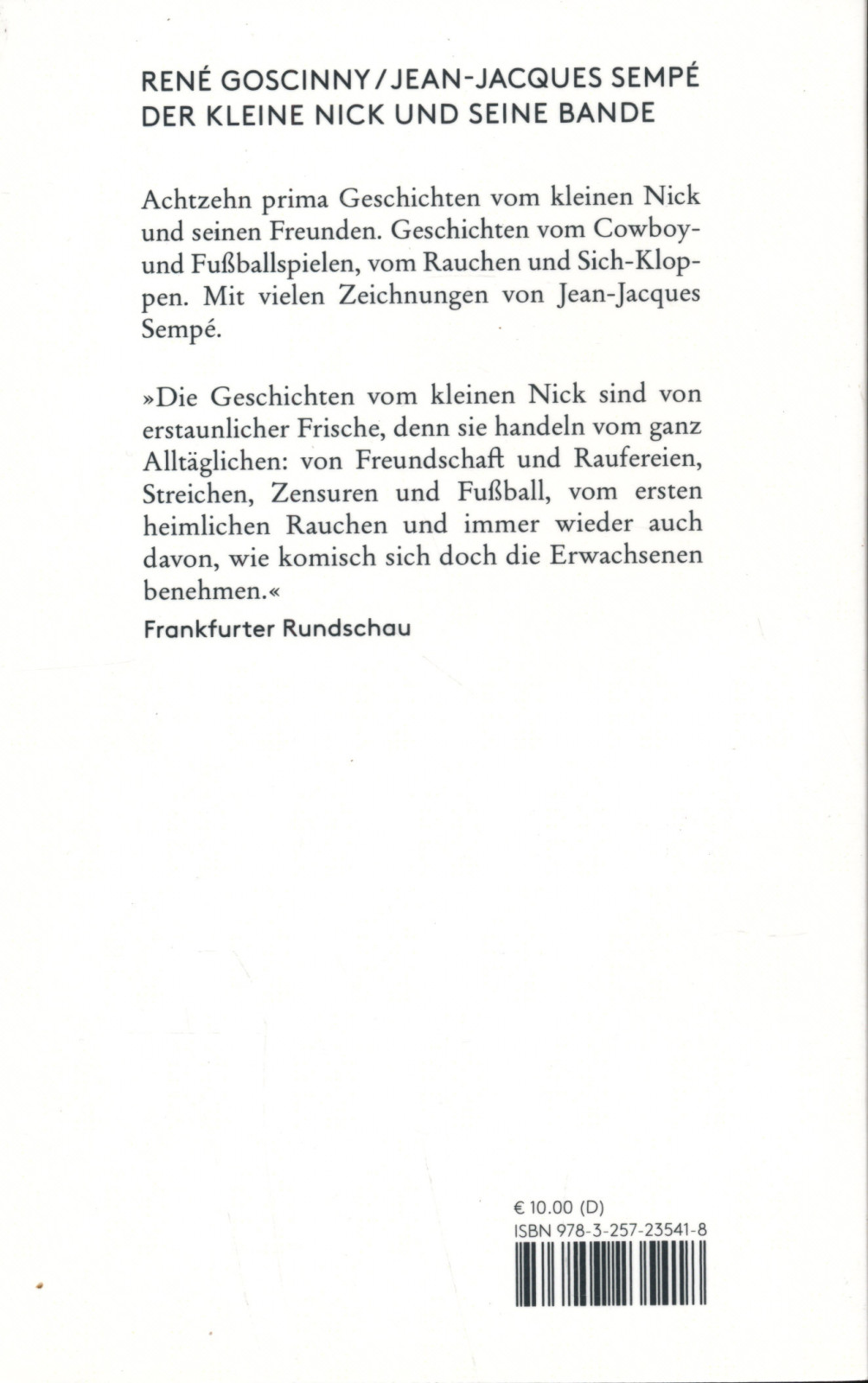Achtzehn prima Geschichten vom kleinen Nick und seinen Freunden - vom Fußballspielen, vom Tag, als Nick als Cowboy seinen Papa an einen Baum fesselt und im Garten vergisst, und über den anderen Tag, als Nick bei Adalbert eingeladen ist (das ist der Streber der Klasse, und keiner mag ihn) und nicht hingehen will, aber dann doch ganz zufrieden ist, weil er Adalbert beibringen kann, wie man Blödsinn macht. Und so weiter. Ganz große Klasse!