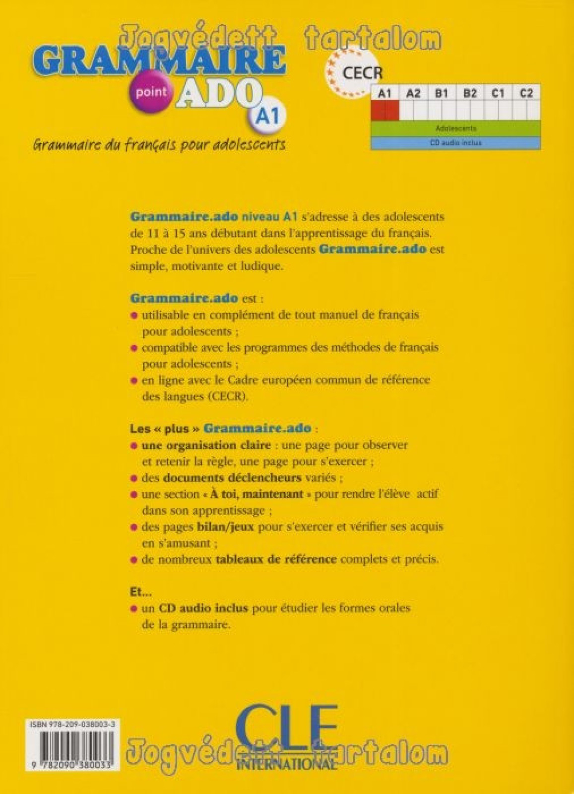 Grammaire.ado est : utilisable en complément de tout manuel de français pour adolescents; compatible avec les programmes des méthodes de français pour adolescents; en ligne avec le Cadre européen commun de référence des langues (CECR). Les "plus" de Grammaire.ado : une organisation claire: une page pour observer et retenir la regle, une page pour s'exercer; des documents éclencheurs variés; une section "A toi, maintenant" pour rendre l'éleve actif dans son apprentissage; des pages bilan/jeux pour s'exercer et vérifier ses acquis en s'amusant; de nombreux tableaux de référence complet et précis.