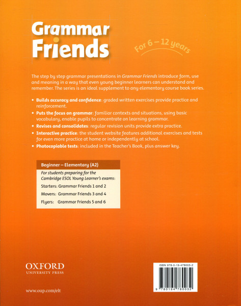 The step-by-step grammar presentations in Grammar Friends introduce form, use and meaning in a way that even young beginner learners can understand and remember. The series was written to support the syllabus of Family and Friends but is an ideal supplement to any elementary general English course. There are lots of controlled activities to help children improve their written grammar and the fun interactive activities on the Grammar Friends Student Website to really encourage them to learn by themselves.