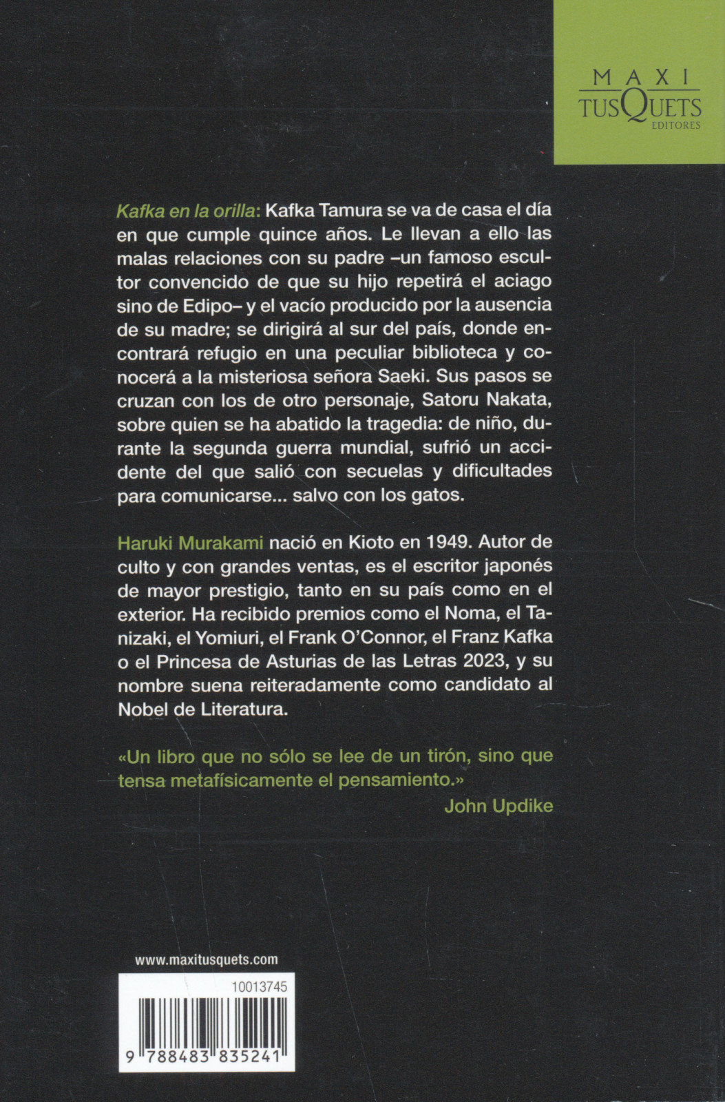 Kafka Tamura se va de casa el día en que cumple quince anos. Le llevan a ello las malas relaciones con su padre - un famoso escultor convencido de que su hijo repetirá el aciago sino de Edipo - y el vacío producido por la ausencia de su madre;