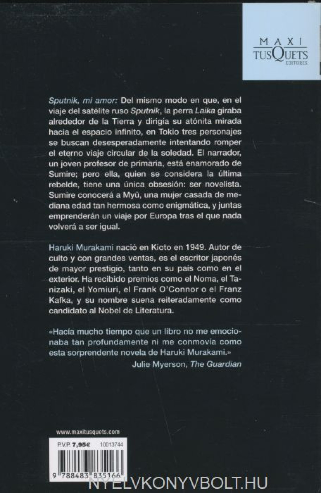 Cuando en mayo de 2001 presentamos alos lectores en lengua espanola la monumental novela Crónica del pájaro que da cuerdaal mundo (Andanzas 443), sabíamos que muchos sucumbirían a la magia dela escritura del japonés Haruki Murakami,de modo que decidimos, a partir de entonces, seguir su trayectoria literaria;por eso publicamos ahora Sputnik, mi amor, su novela másreciente, e iremos editando sus anteriores obras. Traducido, homenajeado y leído en el mundo entero, Murakami también merece darse a conocerdefinitivamente en Espana.