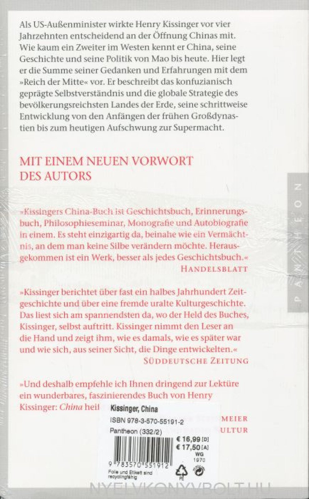 Henry Kissingers besonderen Kenntnisse und exklusiven Kontakte bilden den Hintergrund einer scharfsinnigen Betrachtung, wie Chinas Zukunft aussehen wird und welche Konsequenzen sich daraus für die internationalen Beziehungen ergeben.Als US-Außenminister wirkte Henry Kissinger vor vier Jahrzehnten entscheidend an der Öffnung Chinas mit. Wie kaum ein Zweiter im Westen kennt er China, seine Geschichte und seine Politik von Mao bis heute. Hier legt er die Summe seiner Gedanken und Erfahrungen mit dem »Reich der Mitte« vor. Er beschreibt das konfuzianisch geprägte Selbstverständnis und die globale Strategie des bevölkerungsreichsten Landes der Erde, seine schrittweise Entwicklung von den Anfängen der frühen Großdynastien, die sich bewusst abschotteten,über die ersten kolonialistisch geprägten Kontakte mit der Außenwelt und die maoistische Revolution bis zum heutigen Aufschwung zur Supermacht.