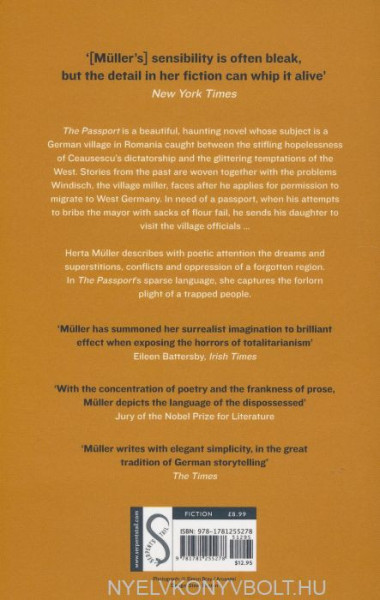 The Passport is a beautiful, haunting novel whose subject is a German village in Romania caught between the stifling hopelessness of Ceausescu's dictatorship and the glittering temptations of the West. Stories from the past are woven together with the problems Windisch, the village miller, faces after he applies for permission to migrate to West Germany.Herta Müller describes with poetic attention the dreams and superstitions, conflicts and oppression of a forgotten region, the Banat, in the Danube Plain. In sparse, lyrical language, Herta Müller captures the forlorn plight of a trapped people.