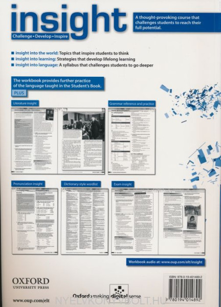 The insight Workbook supports the lessons in the Student's Book with extra exercises for every lesson, a unit-by-unit wordlist with dictionary-style definitions, and a grammar reference and practice section which is linked to the grammar lessons in the S