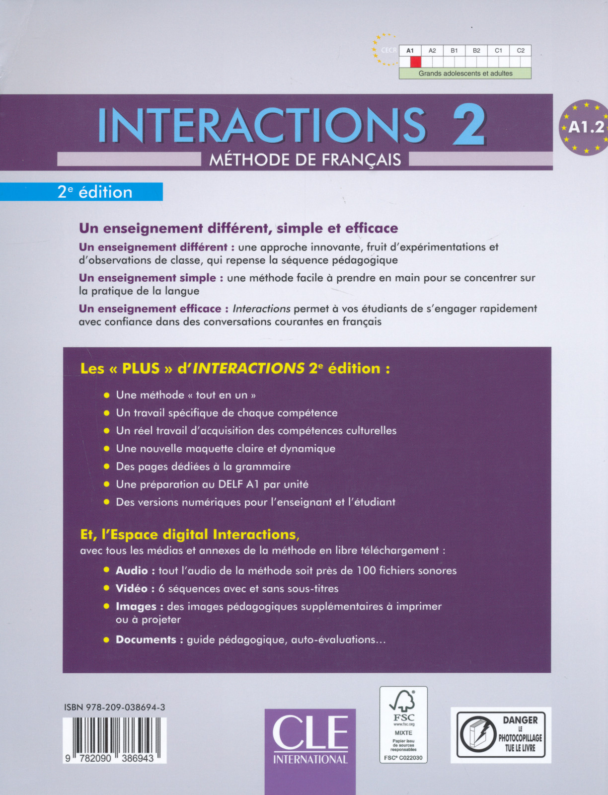 Les "PLUS" d'Interactions 2eme édition:- Une méthode « tout en un »- Un travail spécifique de chaque compétence- Un réel travail d’acquisition des compétences culturelles- Une nouvelle maquette claire et dynamique- Des pages dédiées a la grammaire- Une préparation au DELF A1 par unité- Des versions numériques pour l'enseignant et l'étudiantEt l'espace digital Interactions, avec tous les médias et annexes de la méthode en libre téléchargement :Audio : tout l'audio de la méthode soit plus de 100 fichiers sonores https://interactions.cle-international.com/Vidéo : 6 séquences avec et sans sous-titresImages : des images pédagogiques supplémentaires a imprimer ou a projeterDocuments : guide pédagogique, auto-évaluations, lexiques multilingues...Dans la meme collection